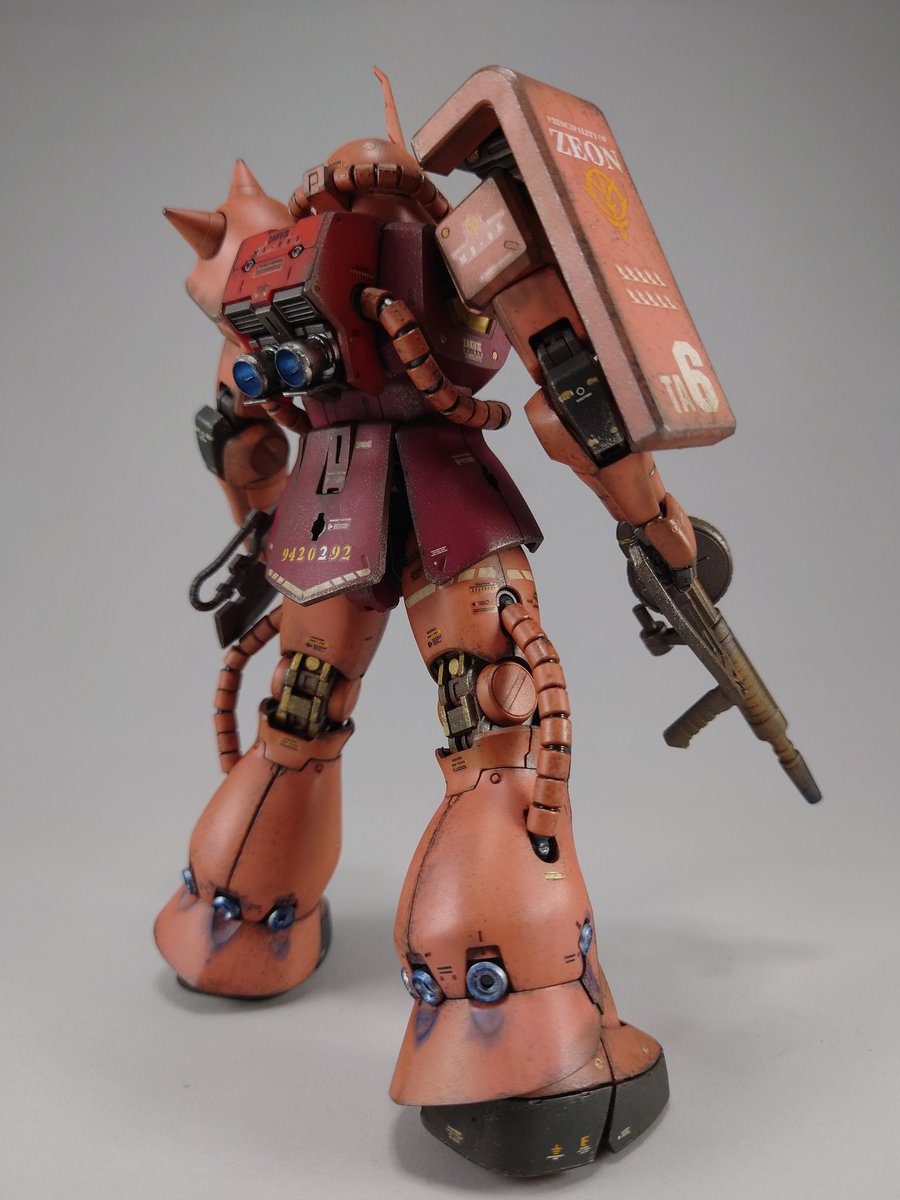 #今月作ったプラモ晒そうぜ さて昨日の上司に引き続き、チームメンバーへのプレゼントはコチラ! MS-06Sシャア専用ザク(MG)を少し彼専用にデコレート♪ 成形色生かしの無改造無塗装簡単汚しで⸜( ॑꒳ ॑ )⸝ 差し色にゴールド入れたりアチコチにオリジナル機体番号入れて専用制高めて楽しめましたぁ♪