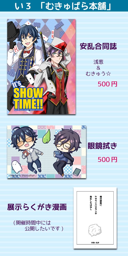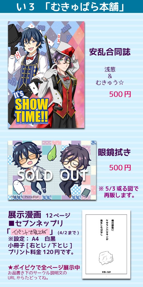 3/25の21時~の安乱webオンリーのお品書きです。 い3「むきゅぱら本舗」にて。漫画合同誌と眼鏡拭きがあるよ!展示らくがき漫画、開始には間に合わないかもしれないですがイベント中には公開予定です。 お楽しみにね! #推理談義を口実に3
