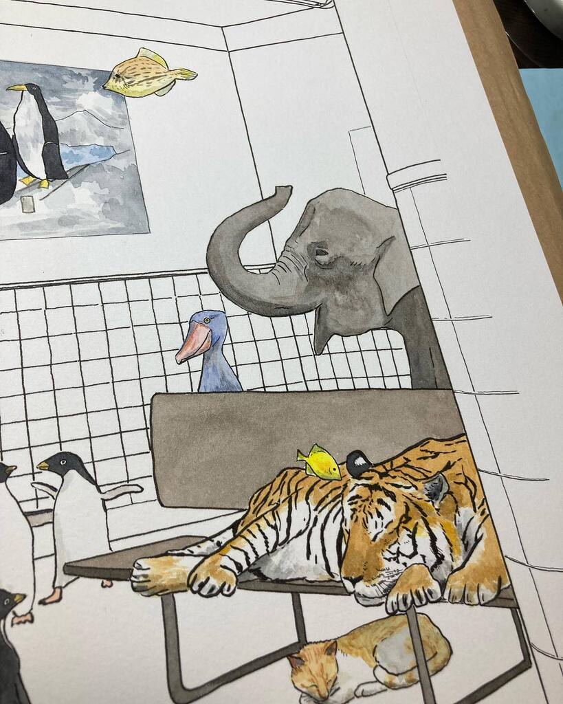 久々にオリジナルです。 鉛筆+透明水彩(422mm×596mm) 自分の好きなテイストで、日常の中に微妙なおとぼけや不思議感を入れてみました。 お城は安土城です。 浮世絵を含む名画が何点か紛れています。 #イラスト #ryoartpaint