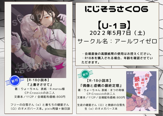 16 59 お品書き作りました。新刊と既刊に関しては会場配布で余ったものをメロブさんに委託予定です。前日まで取置き受け付けますので、希望の方はリプかDMをください。よろしくお願いします。#にじそうさく06 twitter.com/ryochandayo252… 22/04/26 19:12