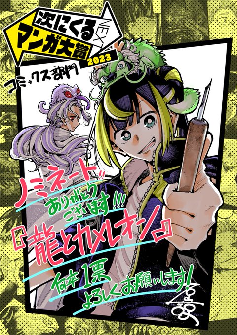 ”次にくるマンガ大賞”に『龍とカメレオン』ノミネートされました~!嬉しい! 推して頂いた皆様のお陰です!ありがとうございます! 大賞はノミネート作品の中から【皆様の投票】で決まるそうなので、是非お力添えを・・!! 投票はコミックス部門からよろしくお願いします! tsugimanga.jp/nominate2023-c…