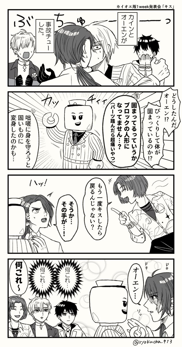 210 1047 おたまほ2の展示物です。魔法使い、年の差現パロ、フォル学、パラロイの4つの世界のカイオエを描きました😊見てくださってありがとうございました!! 21/04/19 00:02