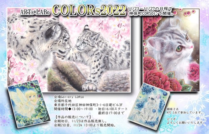 #ARTsLABo 様主催の #COLORs2022 に、額装2点、ATC2点で参加させていただきます。額装作品は以前描いた物ですが、押し画材を使用した自信作なので、チラリとでも原画を見て頂けると嬉しいです。 ATCは押し色の青系で描きました。全て販売作品です。 よろしくお願いいたします🙇