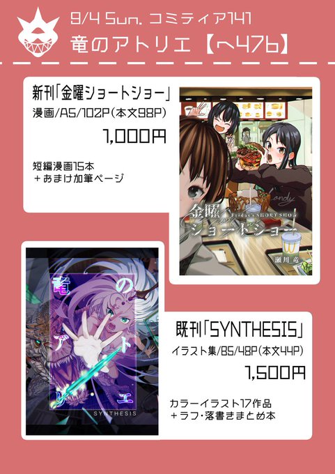 【お知らせ】 9/4 #コミティア141 に参加いたします! 『へ47b/竜のアトリエ』 毎週金曜日に投稿していた漫画を一冊にまとめた新刊1冊と、昨年販売した画集を再販する予定です。 まとめてご購入の場合少しお得になります! 今回は暑い時期の開催なので、熱中症に注意してお越しください!
