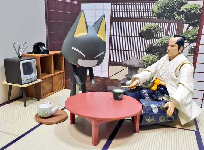 今日は徳田新之助殿が遊びに来たのみャ! 「ささっ、狭い所ですがゆっくりして行ってくださいみャ」 (それにしても、言葉をしゃべりお茶まで出す黒猫に、内心驚きを隠せない吉宗であった) #深夜のクロネコネタ真剣60分一本勝負 #どこでもいっしょ #暴れん坊将軍