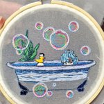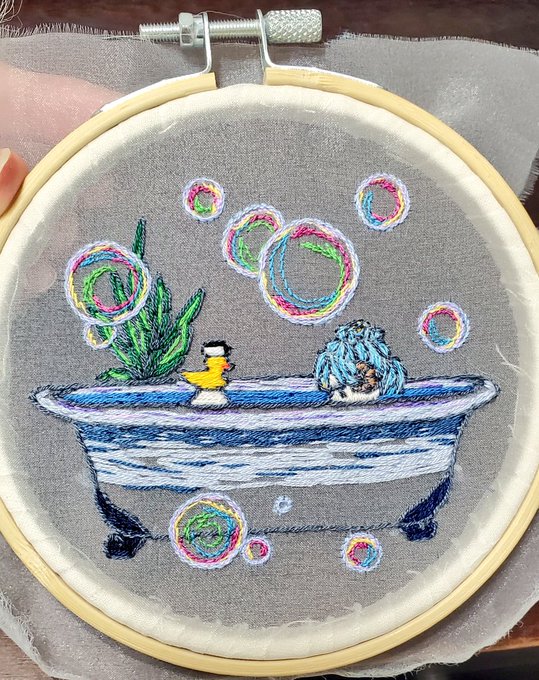 10 34 オーガンジーラピス様ほぼ完成形! あとは展示用枠に移して裁断して裏糸の処理したら終わり! 遠目で見たらシャボン玉ぽいはずなのでこれ以上ごちゃつく前に撤退_(:3 」∠)_ #アイギスお絵かき 23/03/09 22:43