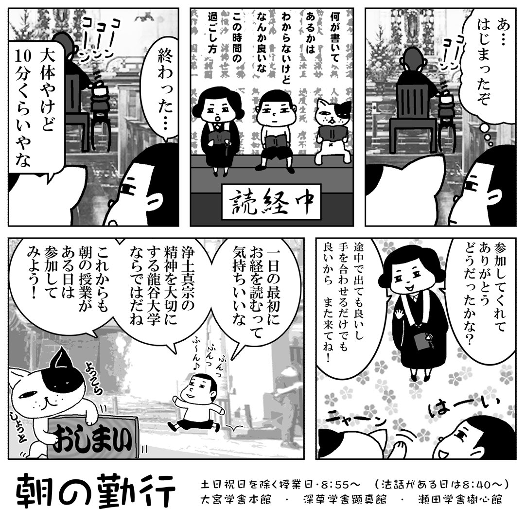 龍大★朝の勤行 土日祝を除く授業期間、大宮・深草・瀬田の礼拝施設で「朝の勤行(ごんぎょう)」をおこなっています。おまいりされる方の信仰の有無や宗教宗派は問いません。朝活感覚でおまいりください(^_-)-☆ ryukoku.ac.jp/shukyo/event/g… #春から龍大 #春から龍谷大学 #漫画が読めるハッシュタグ