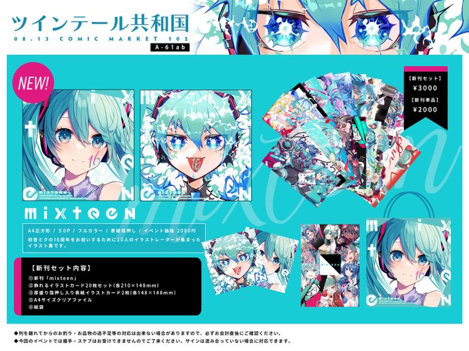 C102はさいねさんと初音ミク16周年記念本を頒布いたします!当たれるツテを全て当たって先輩から同志まで幅広いイラストレーターに集まっていただき、超豪華な一冊になっています!表紙は自分とさいねさんの両A面表紙。会場セットは後日お品書きにて。 通販はこちら↓ melonbooks.co.jp/detail/detail.…