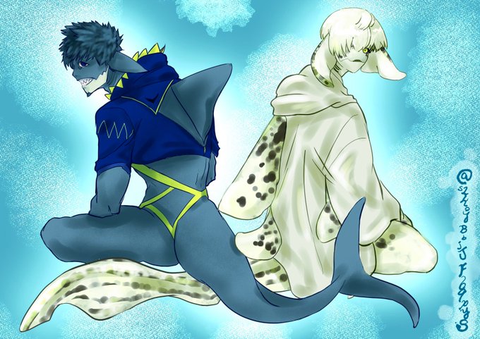 3 19 #人外版深夜の真剣お絵描き60分一本勝負 初参加です❗️ サメ人外&ヒレ耳キャラで失礼します!🙇♀️🦈( '-' 🦈) 👈ホホジロザメ トラフザメ👉 22/07/23 02:37