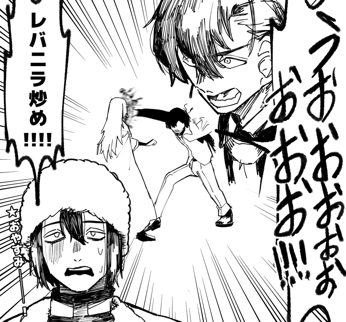 # リプ来たセリフで一コマ描く 「おやすみ」 「レバニラ炒め!!!!!」 「うおおおぉぉぉおおお!!!!」 の3つで描かせていただきました! ありがとうございました!