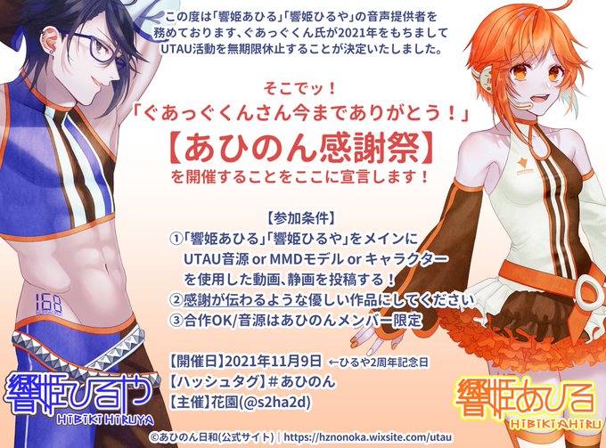 【緊急企画!】#あひのん ぐあっぐくんさん今までありがとう! 【あひのん感謝祭】 を開催することをここに宣言します! 参加条件は「響姫あひる」「響姫ひるや」がメインの作品!沢山のご参加待ってます! ©あひのん日和(公式サイト)|hznonoka.wixsite.com/utau #UTAU