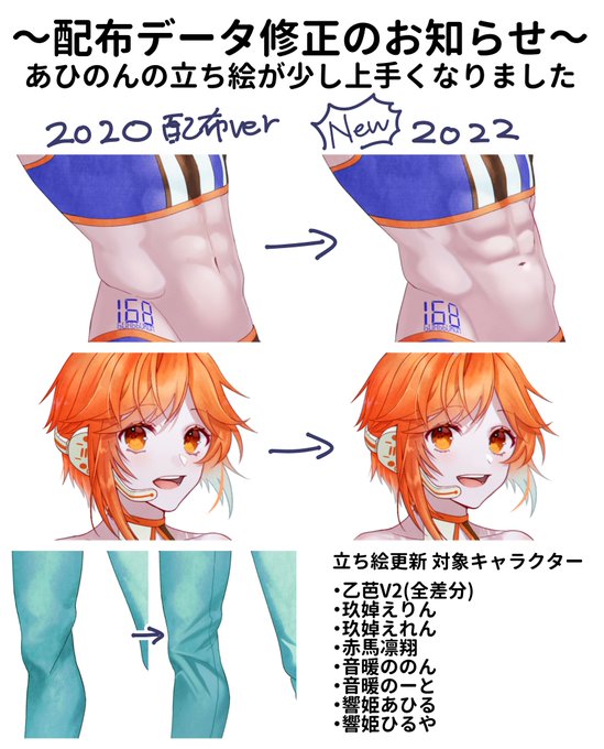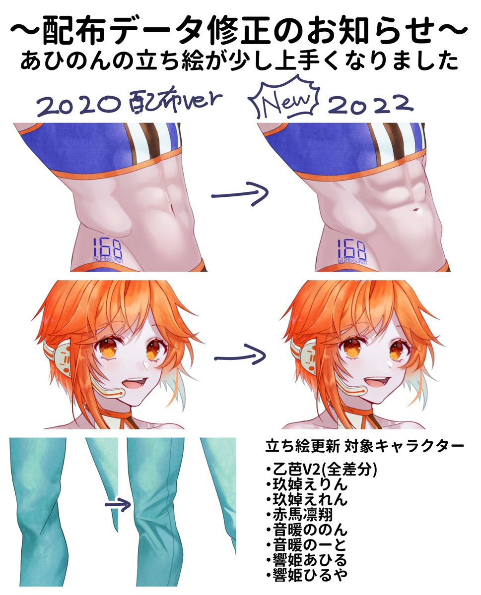 立ち絵を修正、2022年版として配布開始しました。更新は任意です!引き続きよろしくお願いいたします。 対象音源:乙芭V2/玖婥えりん/玖婥えれん/赤馬凛翔/音暖ののん/音暖のーと/響姫あひる/響姫ひるや 配布サイト➡hznonoka.wixsite.com/utau #UTAU #あひのん
