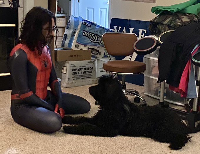 0 11 Boo was very curious about the new Spider in the house. 😆🖤🤟 #spiderman #goldendoodle #cosplay 21/01/13 11:06