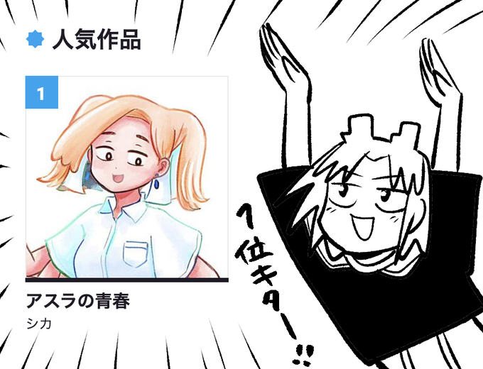 やったーーー!!!!!!!! 人気作品1位〜〜〜〜〜!!!!!!! (相変わらず何基準かは不明) アスラの青春 - ジャンプルーキー! rookie.shonenjump.com/series/pGBIkZl… twitter.com/s714shika/stat…