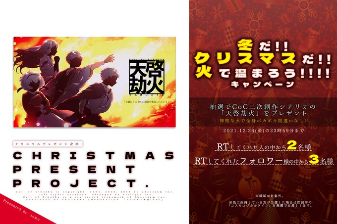 🎄クリスマスなのでシナリオプレゼント企画します🎄 ◆プレゼント内容:「天啓劫火」フルセット ◆「RTしてくれた人の中から2名様」と「RTしてくれたフォロワー様の中から3名様」にプレゼントします! ◆締め切りは12月24日が終わるまで! ◆「天啓劫火」詳細 somu.booth.pm/items/3469849 🎅