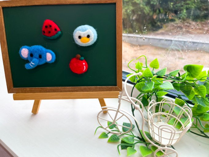 3 12 おはようございます☀ 今日は天気がいい!! ちょっと作品を 飾ってみました🧡 なんか可愛い💕←自己満足 #ハンドメイド #羊毛フェルト #子ども用 #マグネット #ゾウ #りんご #ペンギン #りんご 22/06/23 08:08
