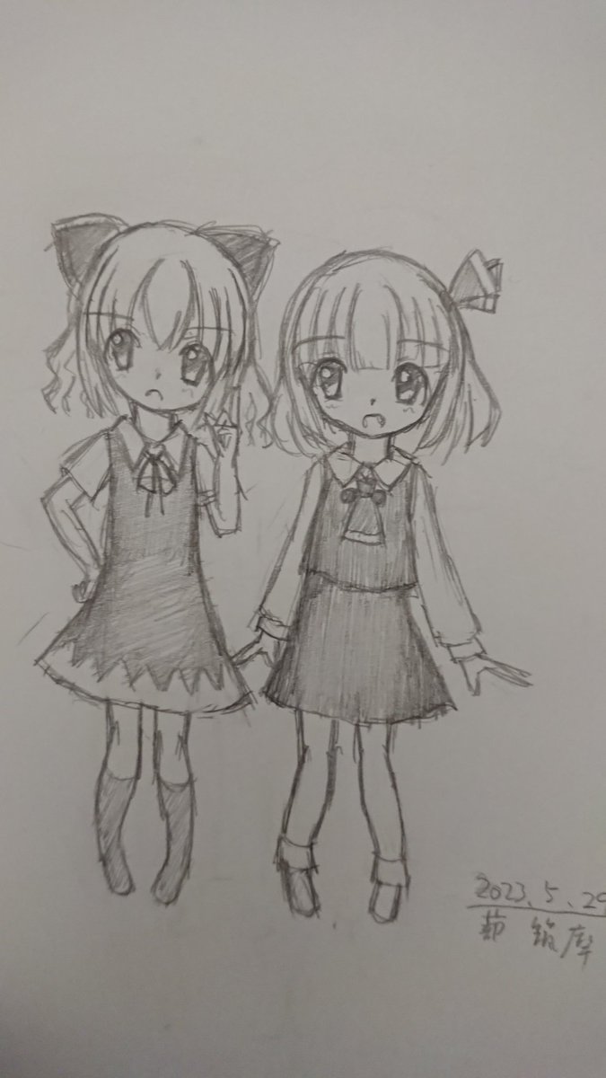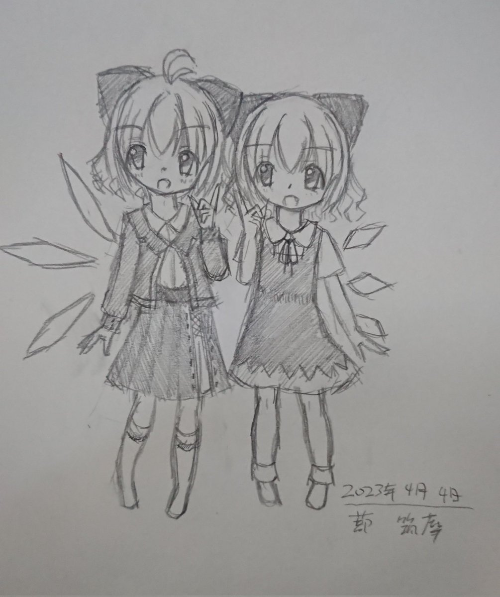 ( ・ω・)<ゼンインクエナイ もしも現実で大チルが居たら…って感じで描いてみた大妖精とチルノ。 私服思い付かんかったから制服っぽく。写真上手く撮れん😓 #絵描きさんと繫がりたい #チルノ #大妖精