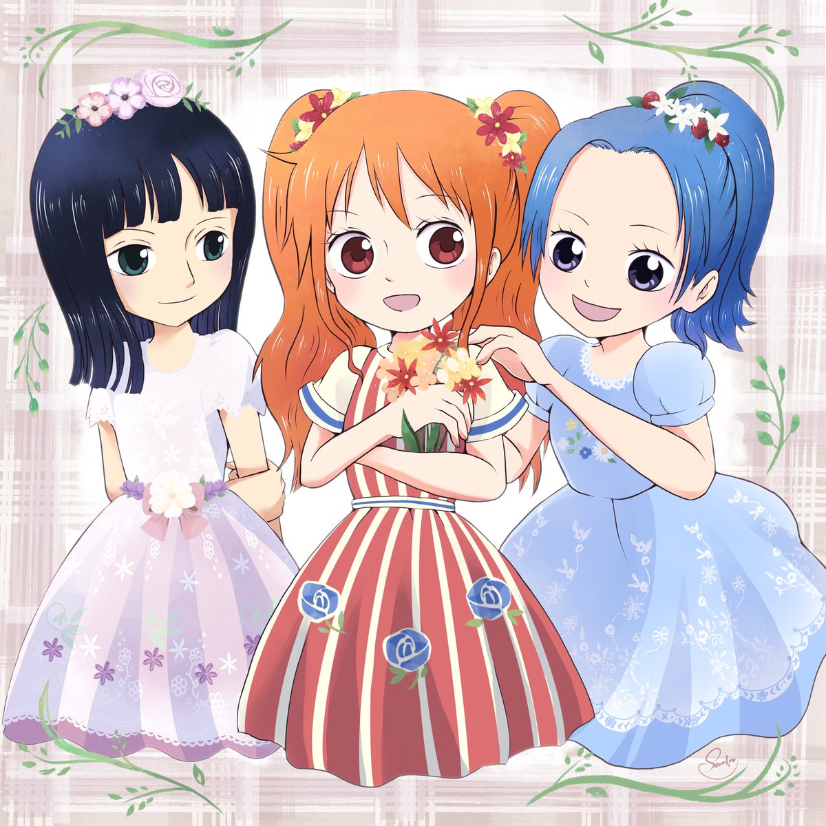 ダフィフレ今春のスプリングインブルーム衣装が好きすぎてワンピガールズに着せてみた🌼💐🌸 ロビン🌸ルーちゃん、ナミ🌺アンちゃん、ビビ🍓メイちゃん