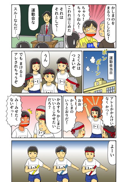 4 6 前話での行いが元で窮地に立たされた神栖光と鹿嶋光。そして絶対に負けられない運動会の日がやってきて…という漫画を描きました。 「でーん!~ひかりとひかり~」第3話「ぼくははしってはいになる」(1/2) #エアコミティア 21/02/21 12:01