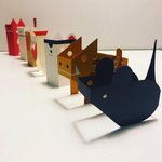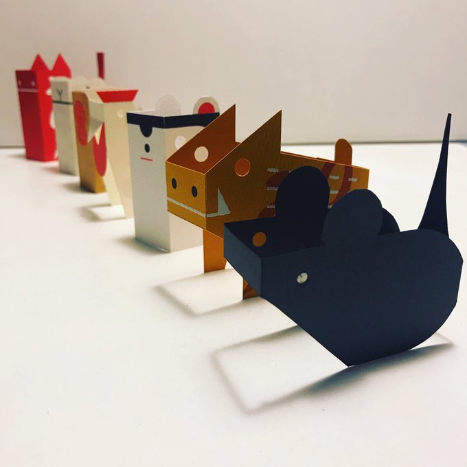 センパイと記念撮影。 奥からうまヒツジさるトリいぬイねウシ。 というわけで、来年の丑ができました。 今夜発売! お楽しみにー #年賀状 #干支 #ペーパークラフト #丑 #赤べこ