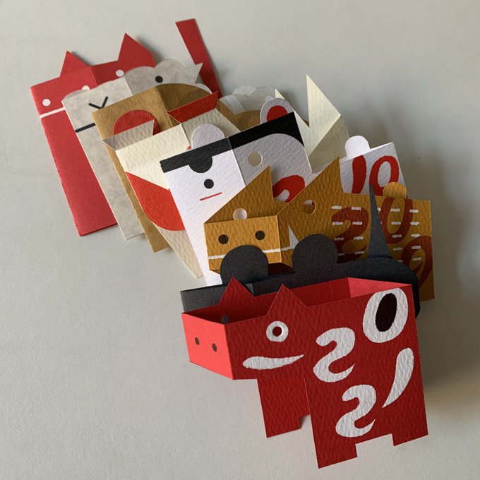 0 3 センパイと記念撮影。 奥からうまヒツジさるトリいぬイねウシ。 というわけで、来年の丑ができました。 今夜発売! お楽しみにー #年賀状 #干支 #ペーパークラフト #丑 #赤べこ 20/12/21 15:33