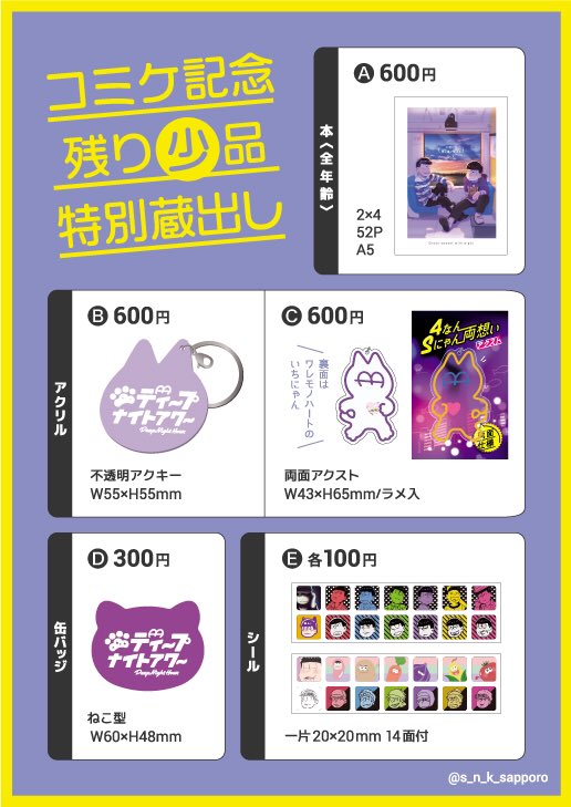 おそ松さん、一松中心既刊メインで、新しくアクリル作りました!残り少なく封印してた物も色々持って参ります〜久々のお祭り楽しみ😄 #C101お品書き
