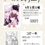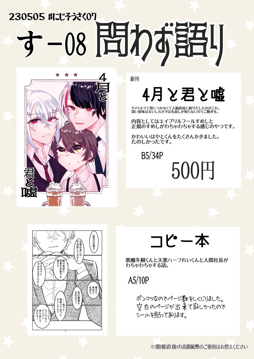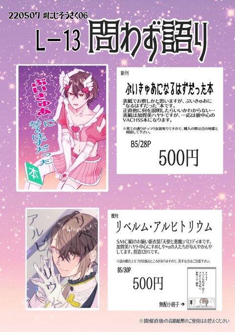 1 3 #にじそうさく07 お品書きとサンプルです! 【す-08】にて エイプリルフールSMC組本です。既刊は発注忘れたのでないです。ノベルティとして10Pのコピー本がついてきます。また友達がコス売り子をしてくれる予定です!感謝!ただ誰のコスをするのかは明日まで私も知りません!!とても楽しみ!! 23/05/04 22:30