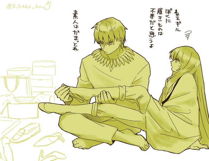 フィッティングするギルエル 靴イベってわかってたら何か履かせたものを!!ってぷんすこしてそうな王様 後半始まった瞬間「ドゥさん裸足やん…」てなったので