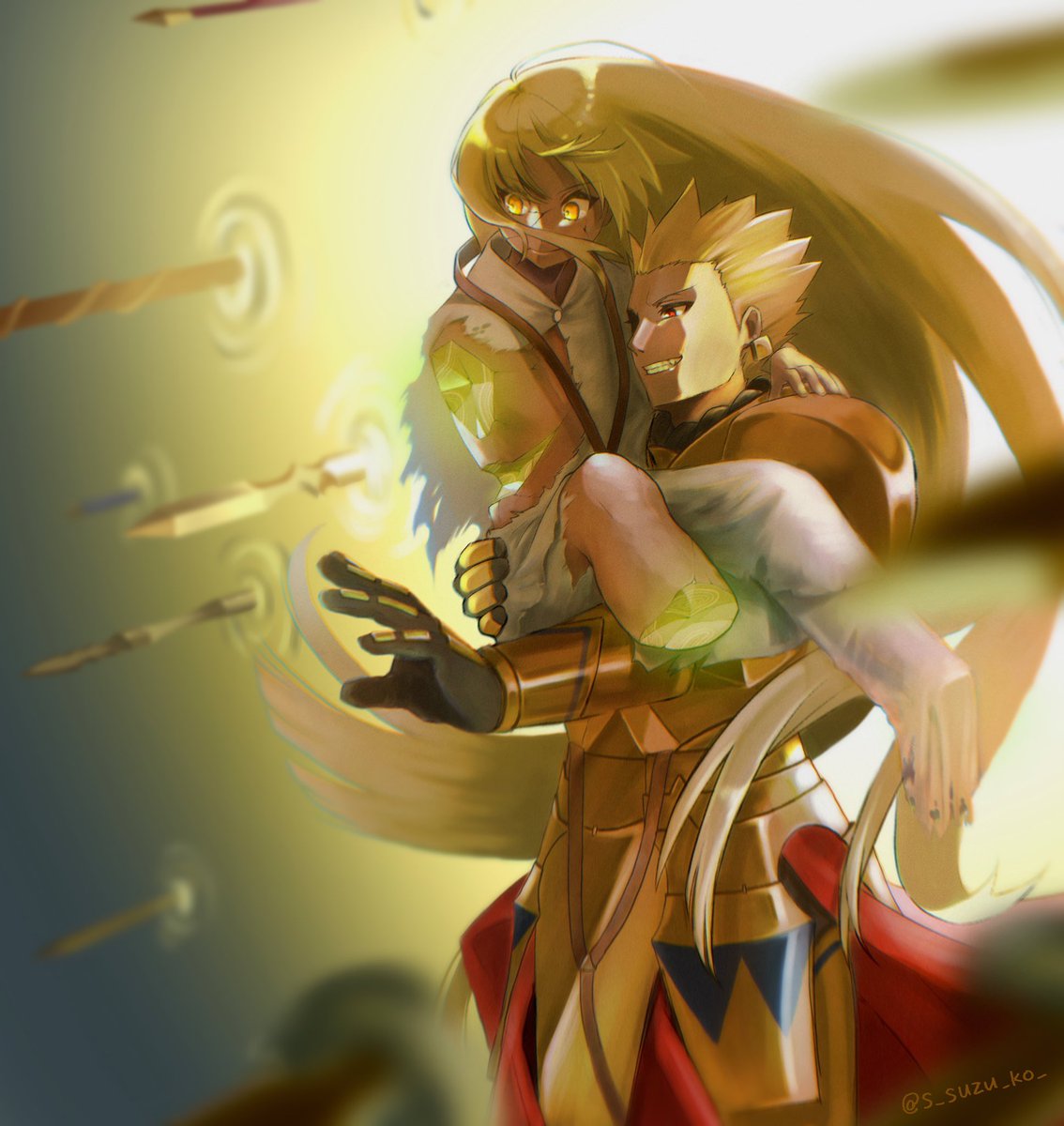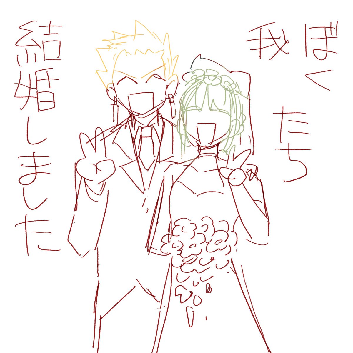 14 72 カルデア四月馬鹿特別賞 ギルエル「我(僕)たち結婚しました‼️」 嘘じゃないのでは?という審議の結果特別賞に落ち着いたやつ ガチの嘘でもいいし嘘じゃないけど?も捨て難い 所用でエイプリルフール中に書き上げられないから落書きだけ上げちゃうね 23/04/01 02:15