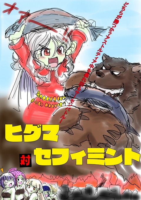 12 104 さくやのドワ子温泉♨️でセフィミンのサーモンの食いっぷりが話題になり… 対抗出来るのはヒグマのみwという ネタから描いた落書き😂 22/07/27 12:12