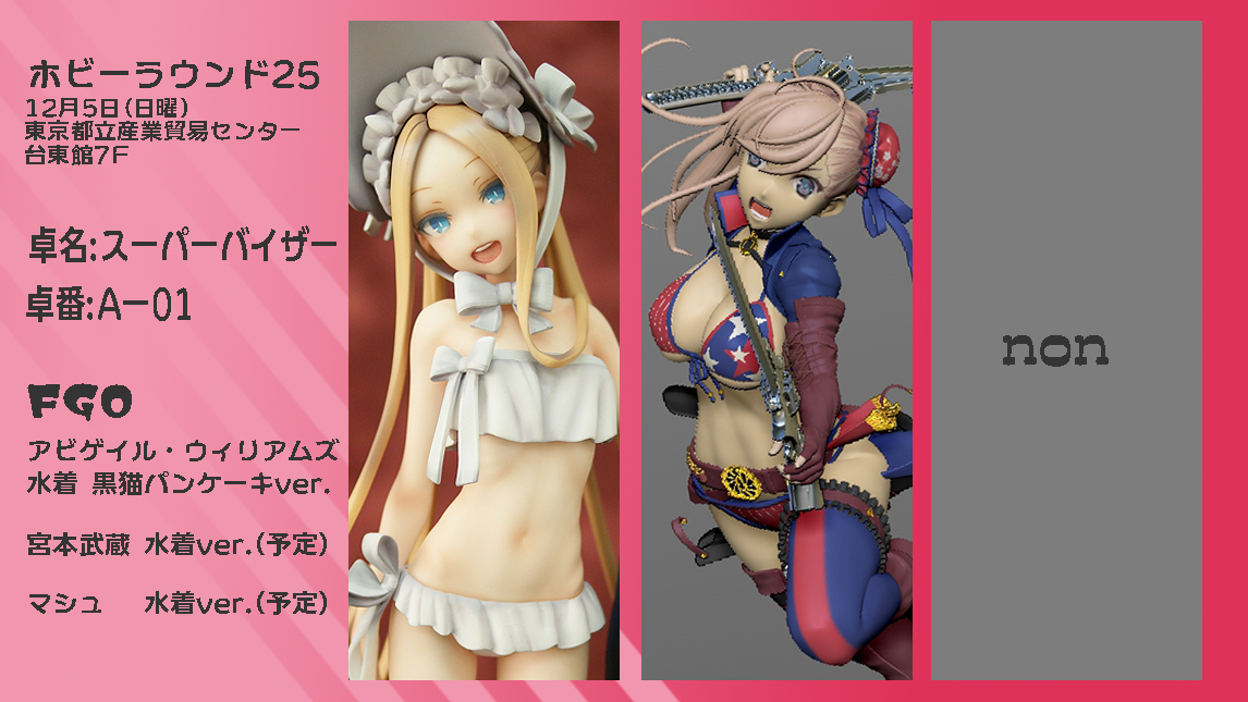 ホビーラウンド25 (12月5日)の出展のお知らせ。今回は水着アビゲイル 再販と、武藏 水着、マシュ 水着の予定です。詳細はブログをご覧ください svisor.blog104.fc2.com 入場にはガイドブックの事前購入(21日まで)が必要となりますのでご注意下さい。 #ホビラン #FGO