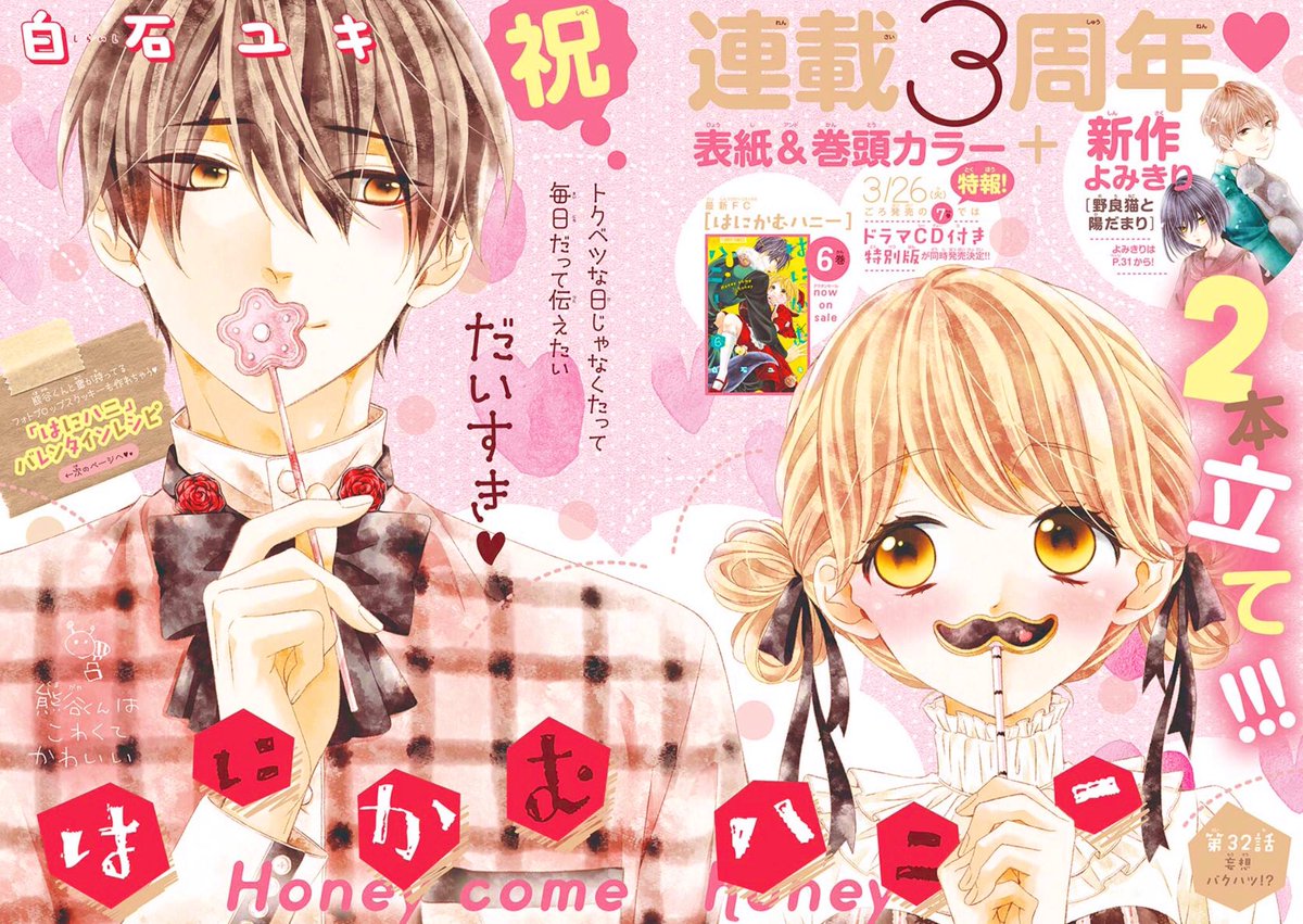 本日は Sho-Comi 21号の発売日☆ はにかむハニーセンターカラーで掲載中です。約2年半お付き合いくださいましてありがとうございました。蜜と熊谷くんを好きになってもらえて幸せでした☺️ 最終話、どうぞよろしくお願いします。