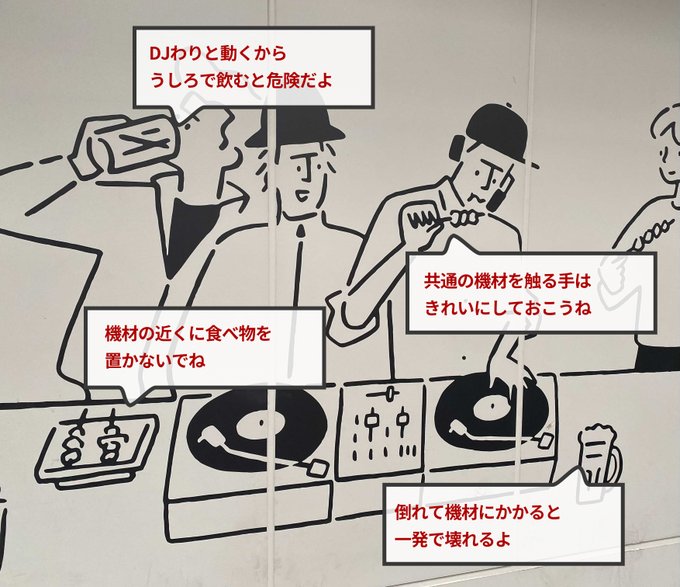 DJなら一度は遭遇した場面がたくさん詰まったウォールアートがあったので、説明書いておきます