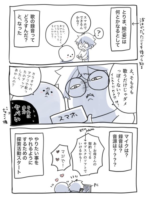 『娘(小4)がVtuberになりたいと言い出した⑥』 時間が取れる春休みまで、 娘と分業。 娘はキャラ作り。 私は… 動画の作り方や録音、Mixや歌みたのやり方を 調べる!! ということに、なりました!! #育児漫画 #おやすみVtuber 明日は予定あるので、おはよう合わせの更新は、なしです><
