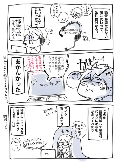 『娘(小4)がVtuberになりたいと言い出した⑧』 録音環境、設定編? 娘の歌を私がMIXするため、 師匠に教えを乞うているんですが。。 吸音材に。。毛布は。。いいぞ。。 (しかし通年出しておけない問題;) 毎回丁寧に教えてくださり、感謝です。 #育児漫画 #おやすみVtuber