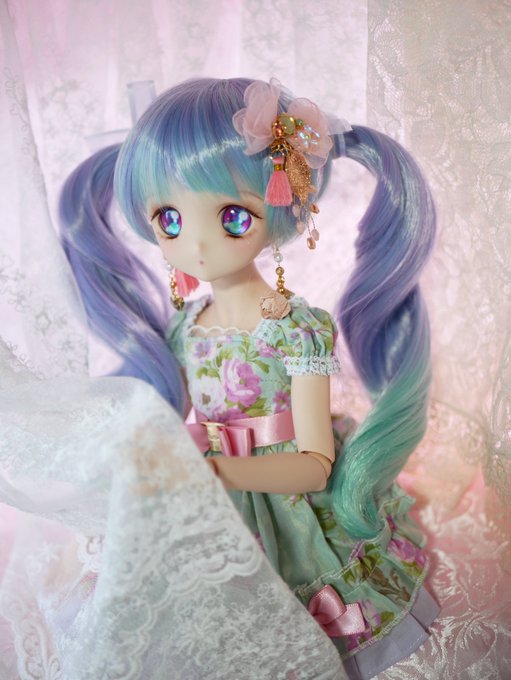 #nar_noir_doll 様よりお迎えした22番ちゃん🌸桜餅みたいなとっても可愛い子です😍 キラキラ若葉色のアイメイクに艶ぷるなリップ、細部まで美しすぎます✨ 💎エメラルドのアイ→#夜アイ 様 👘華やかなお着物→#お華着 様 🌸サクラピンクなウィッグ→#mimiel_doll 様 #MDDはいいぞ #はちす百花