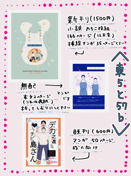 3月19日鯉月オンリーお品書きです 新刊サンプル→ pixiv.net/artworks/10543… 委託→🐯ec.toranoana.jp/joshi_r/ec/ite… 🍈 melonbooks.co.jp/fromagee/detai… サークル様向けトリオキニ→ triokini.com/circle/item/13… 既刊→ pixiv.net/artworks/10285… 開始20分程は買い物に出かけております。欲望に忠実ですみません…