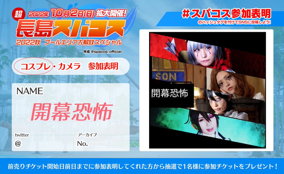 2022年10月2日(日) SAKURA Cos Act in長島スパコス チーム名『開幕恐怖』 第五チームでコスパフォに出演させていただきます。楽しみです。よろしくお願いします。 #長島スパコス #さくコス