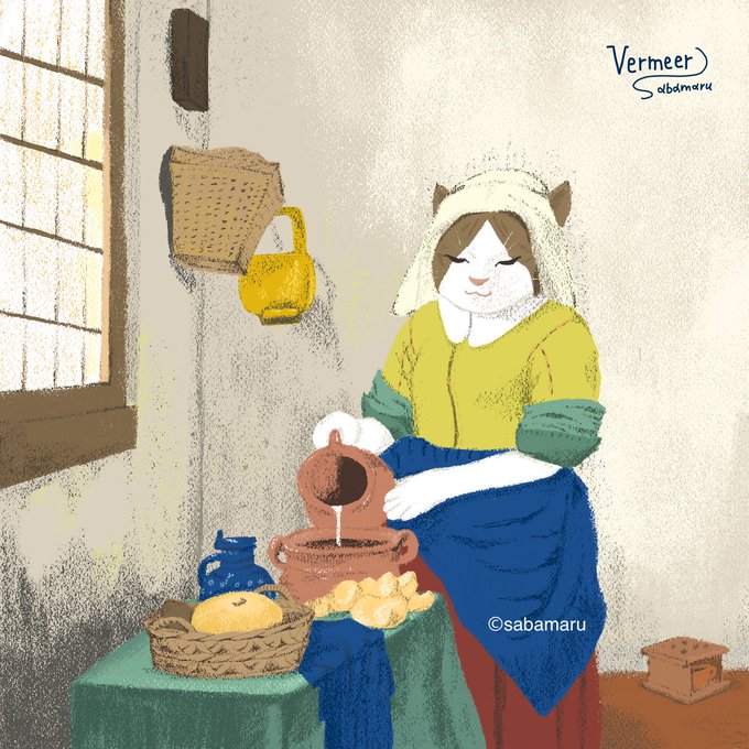 美術館シリーズ🎨「牛乳を注ぐ女」 連続でフェルメールの作品になりますが、伏し目の猫の表情に注目です🐈❣️ #絵画 #イラスト #絵描きさんと繋がりたい #illustration #動物イラスト #art