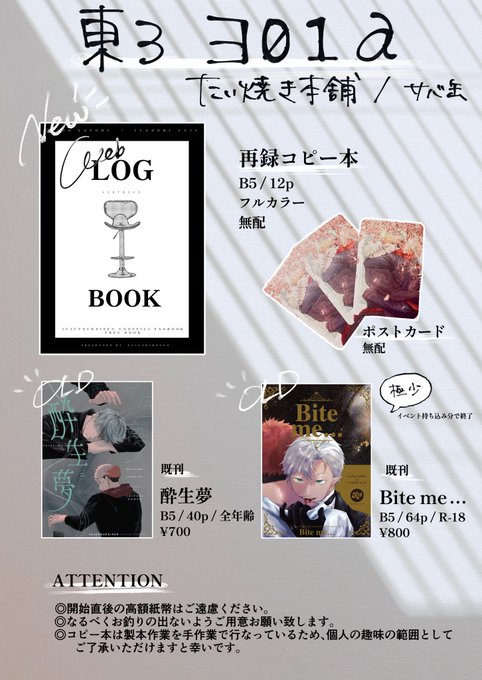 5/4 【お品書き】 コピ本は諸事情により(表に未掲載のものを含む)再録のみ収録となります🙇 製本が手作業の為少なめです… (残部がでればインテに回します) 当日になってしまいましたが本日はよろしくお願いします🤲