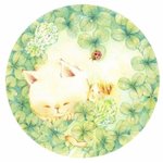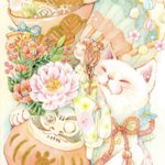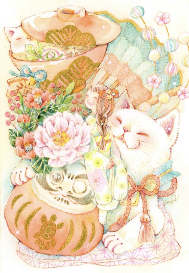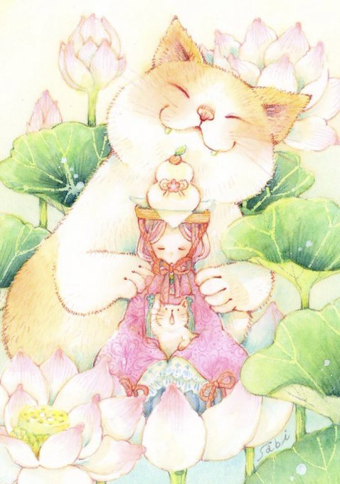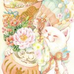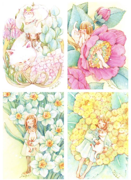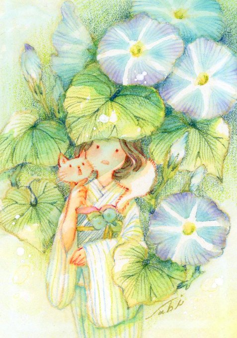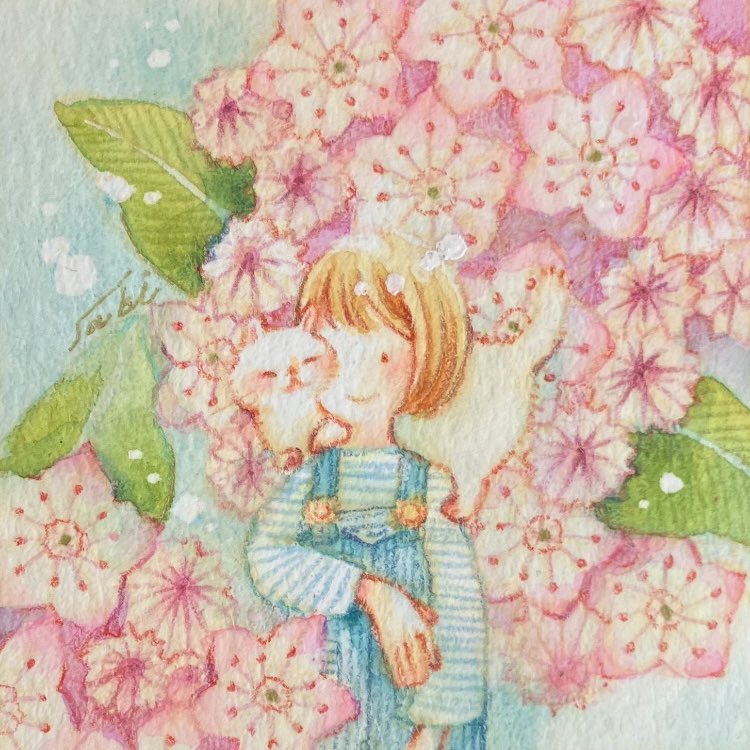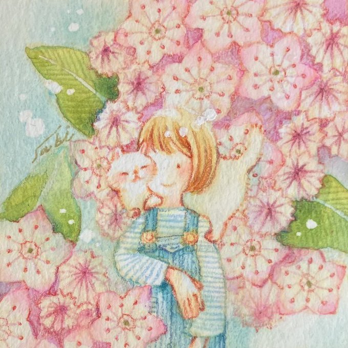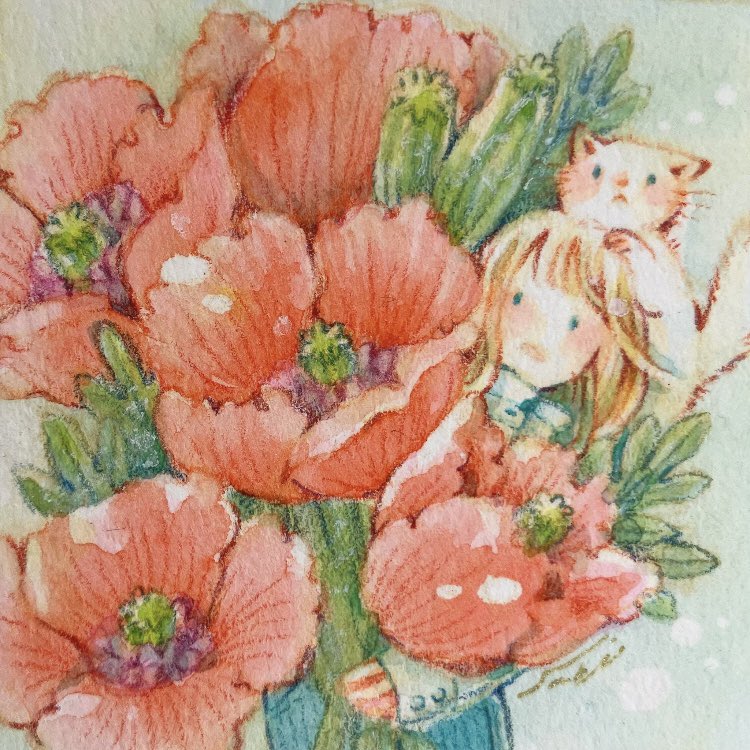 「 青い瞳、異国の花 」 ナガミヒナゲシの花は、異国の花。 猫も女の子もお揃いで異国をイメージし青い瞳にしてみました。 写真では彩度が落ちてしまいましたが、原画は使用したセヌリエのオレンジの絵の具が鮮やかで元気の出るお色です。 #メルメリィアンテナShop