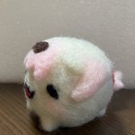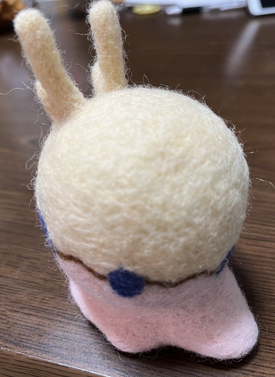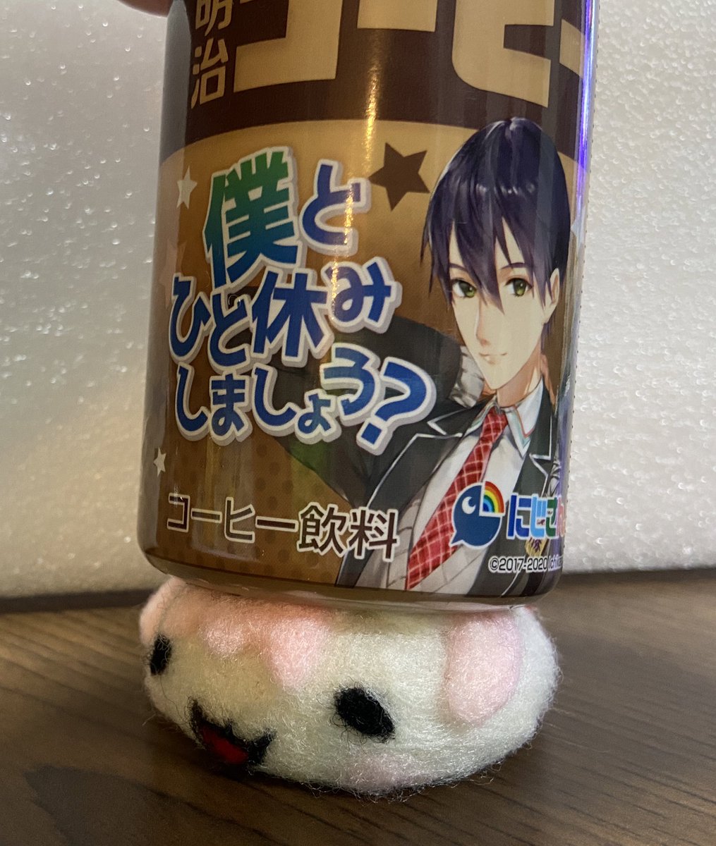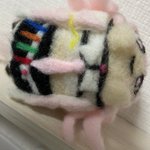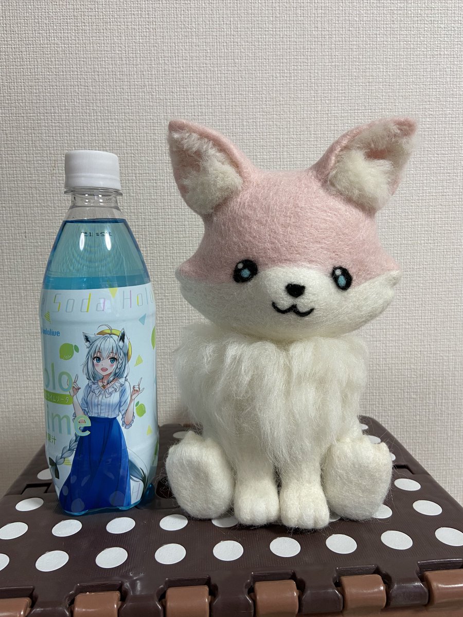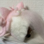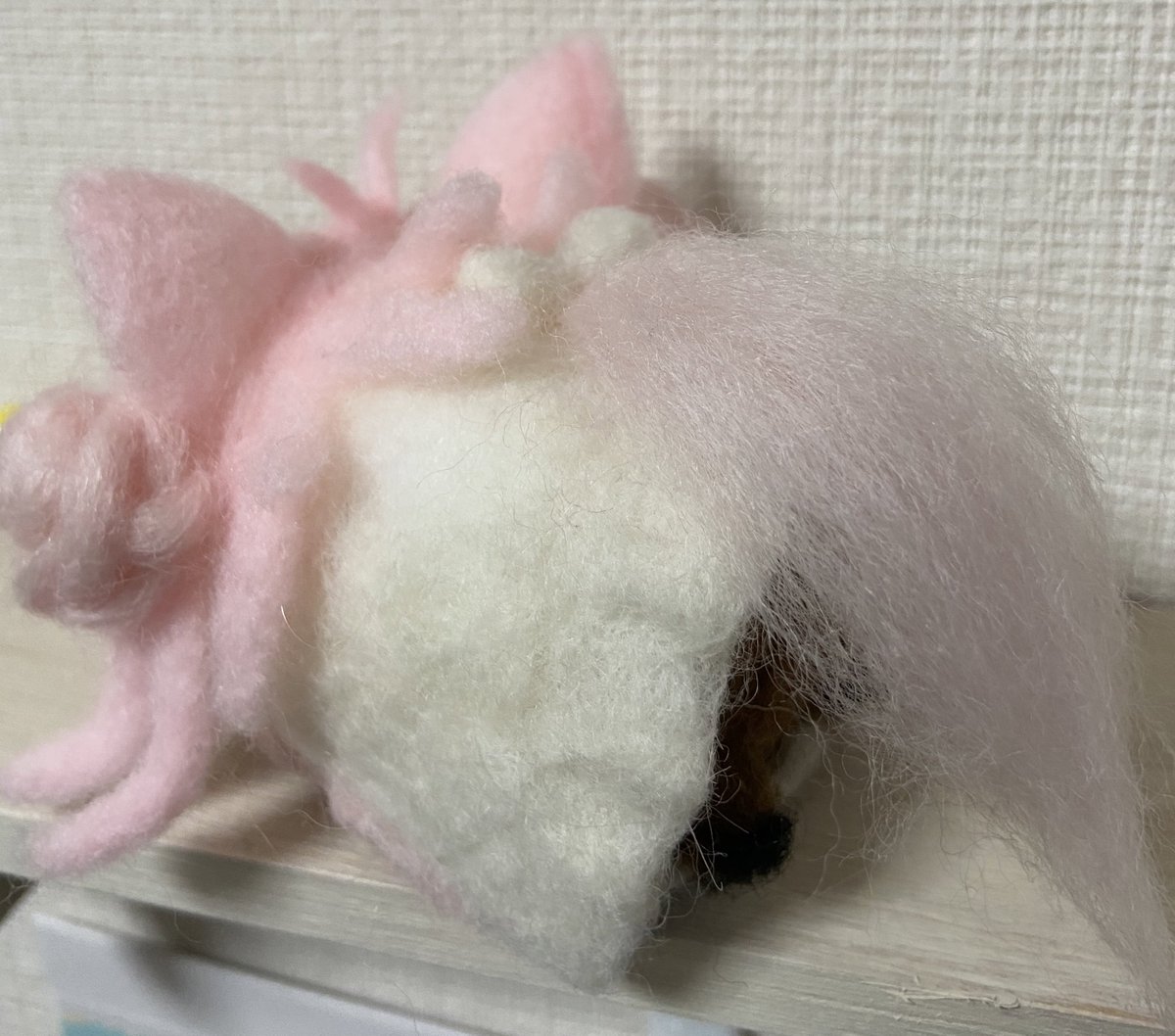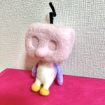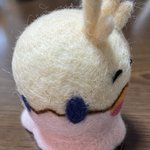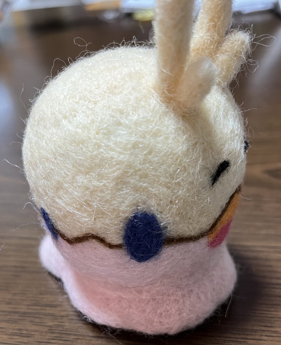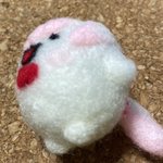 餅月なこさんのマスコット「おもち」 待機所でいつも餅たべてるのがかわいい 羊毛製の羽根は浮かせられる力がなかったので背中にくっつけました (ボトルガムはサイズ比較です) #餅月なこ #nacochi_Art #羊毛フェルト