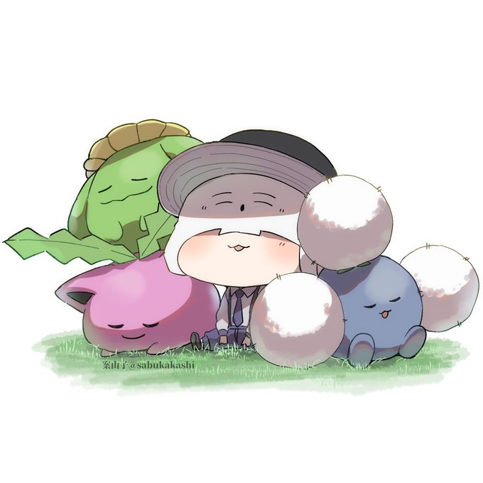 お題箱より「ハネッコとワタッコに挟まれて寝ているトラゾーさん」 せっかくだからポポッコも添えた。