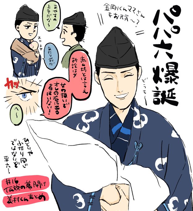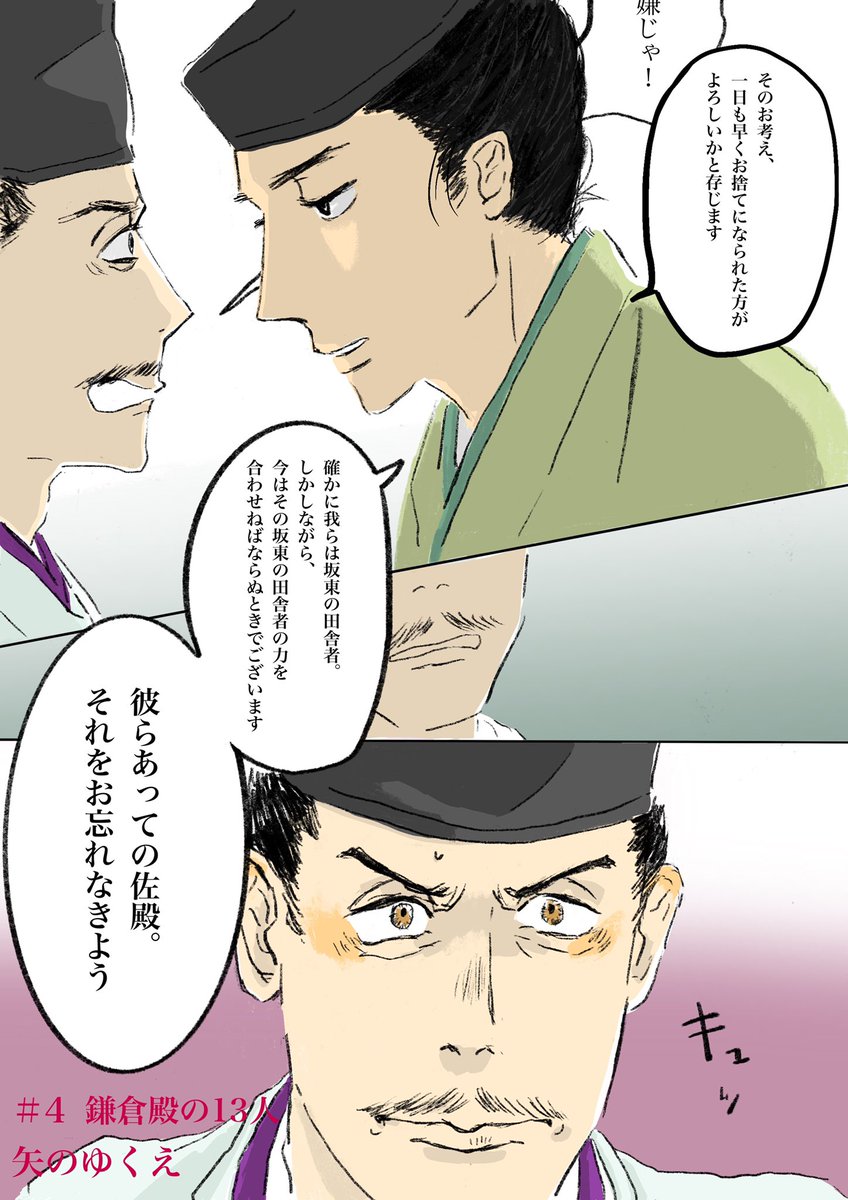 もうだめ…義村くんのキメ顔の瞬間、ギャ!カコイイ!と爆笑が同時に来てしまうようになってしまった。あと小四郎、平六いないのもっと早く気付いたげてぇ…でもその報われなさが堪らない…ずっとそのままの君でいてくれ平六ー‼︎ #殿絵 #鎌倉絵 #鎌倉殿の13人