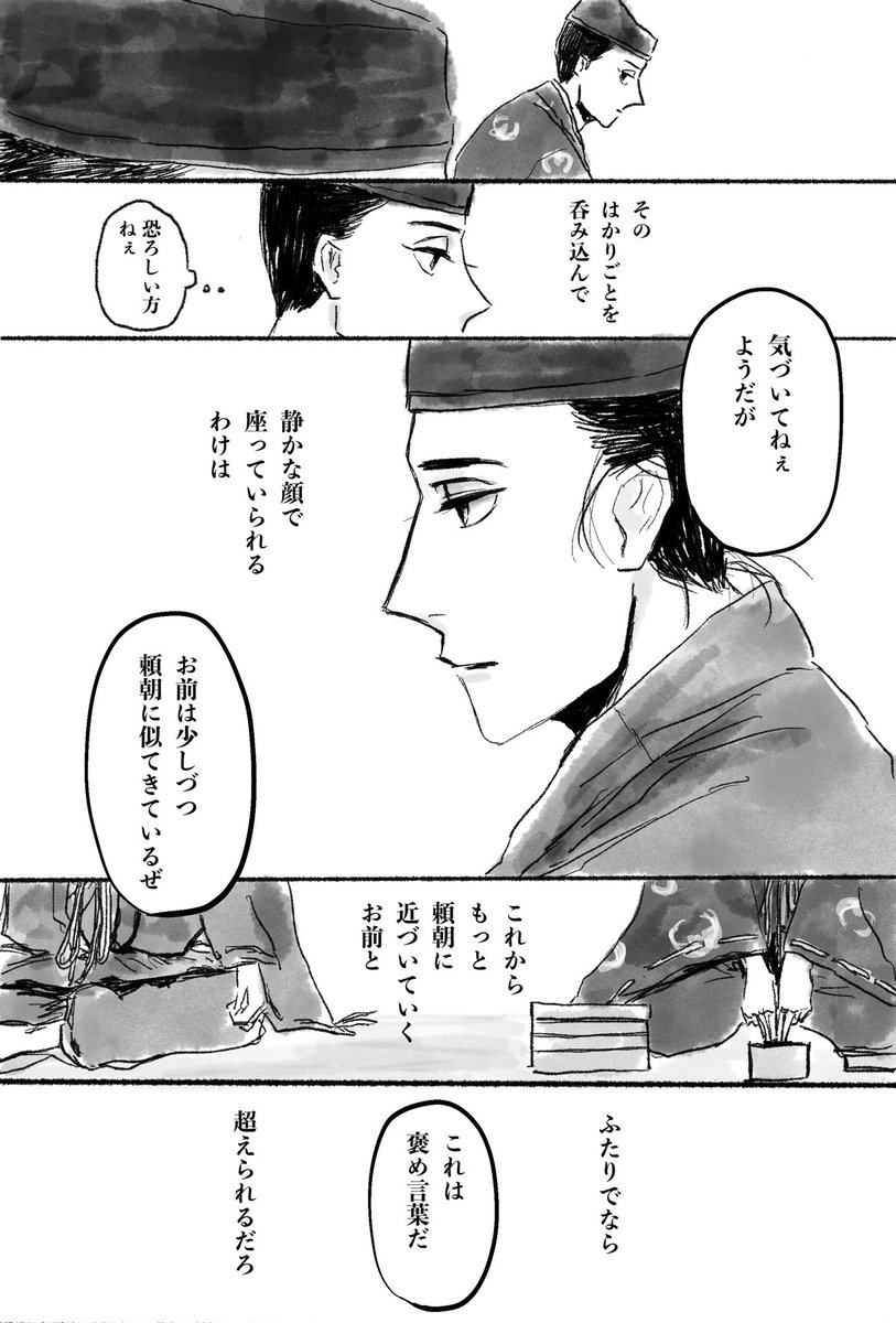 92 358 15話の盟友まんが(平六目線) ふたりだけで喋るあのシーンが印象的で自分なりに解釈して描きました。 二人の関係は結局、大河ドラマ館にあるという噂のヤマコーさんのサイン「いくぞ!小四郎!」が全てを物語っている気がする。 #鎌倉殿の13人 #殿絵 22/04/26 07:08