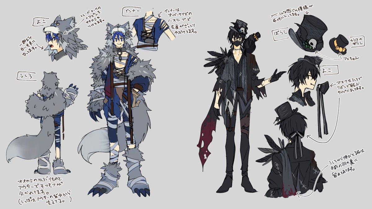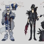 改めて、カムイさんと八咫さんの歌ってみたお手伝いさせて頂きました🙏✨ マミーポコさんにミニキャラ描いてもらえるということでキャラデザラフ気合い入れて作りました🐺🕸️