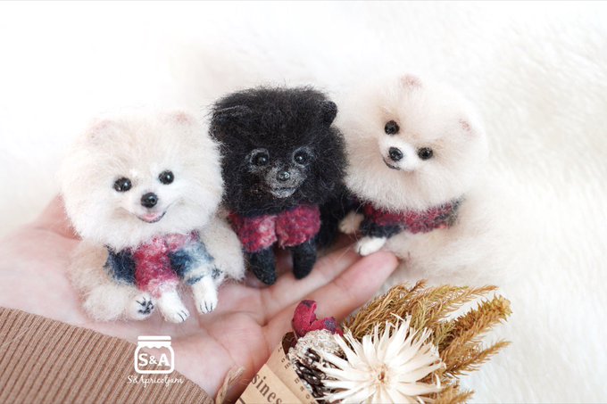 6.5cmのおチビちゃん達。 ポメラニアン可愛い🥰 左からクリームちゃん、ブラックちゃん、ホワイトちゃん。 クリームがホワイトに見える? 鮮やかに撮影するにはどうすればいいの😅 #羊毛フェルト #needlefelt
