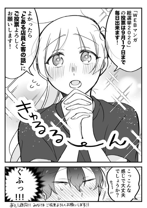 Webマンガ総選挙に是非『とある店員と客の話』を推してやって下さい😊🙏🌼 よろしくお願いいたします🌸 WEBマンガ総選挙2020ノミネート作品募集中! → webmanga-sousenkyo.com