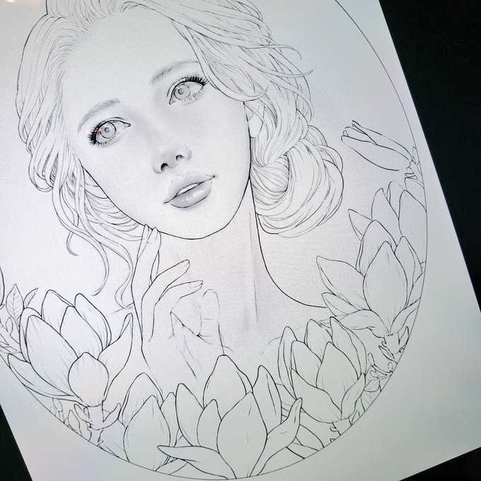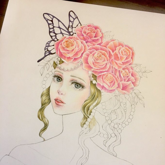 経過。薔薇塗りを終えたというだけで心が軽い( ⁎°᷄ ᐞ °᷅ ) ゆっくりだけど着実に進んでます。 ちなみに私のメイン色鉛筆は、プリズマカラーとカランダッシュ パブロです。 #イラスト #色鉛筆画