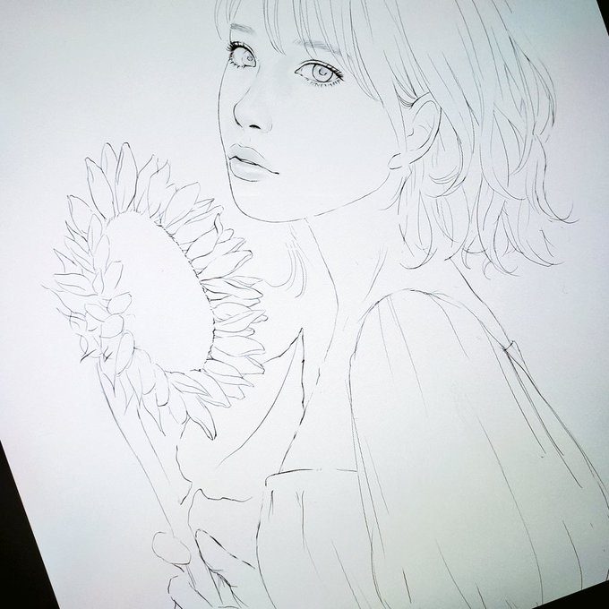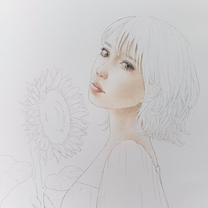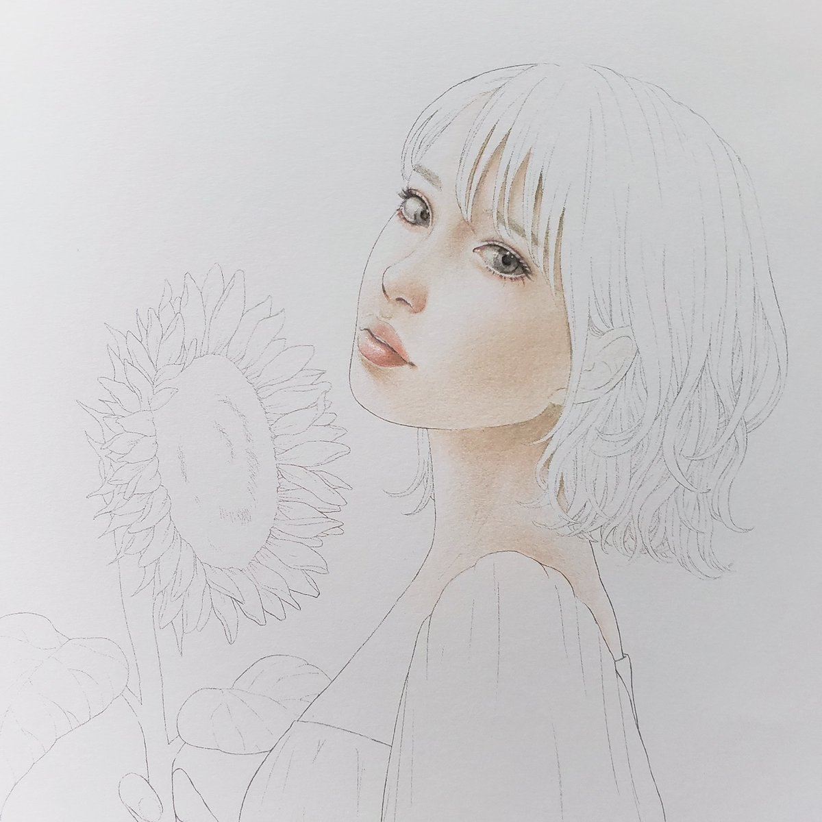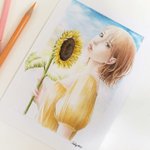 1 19 先週末に無料配信した向日葵の子、 小さく印刷して試しに少し着色🌻 これくらい中途半端に塗った状態で じーっと眺める時間好き #イラスト #夏のイラスト #色鉛筆 22/08/02 05:29